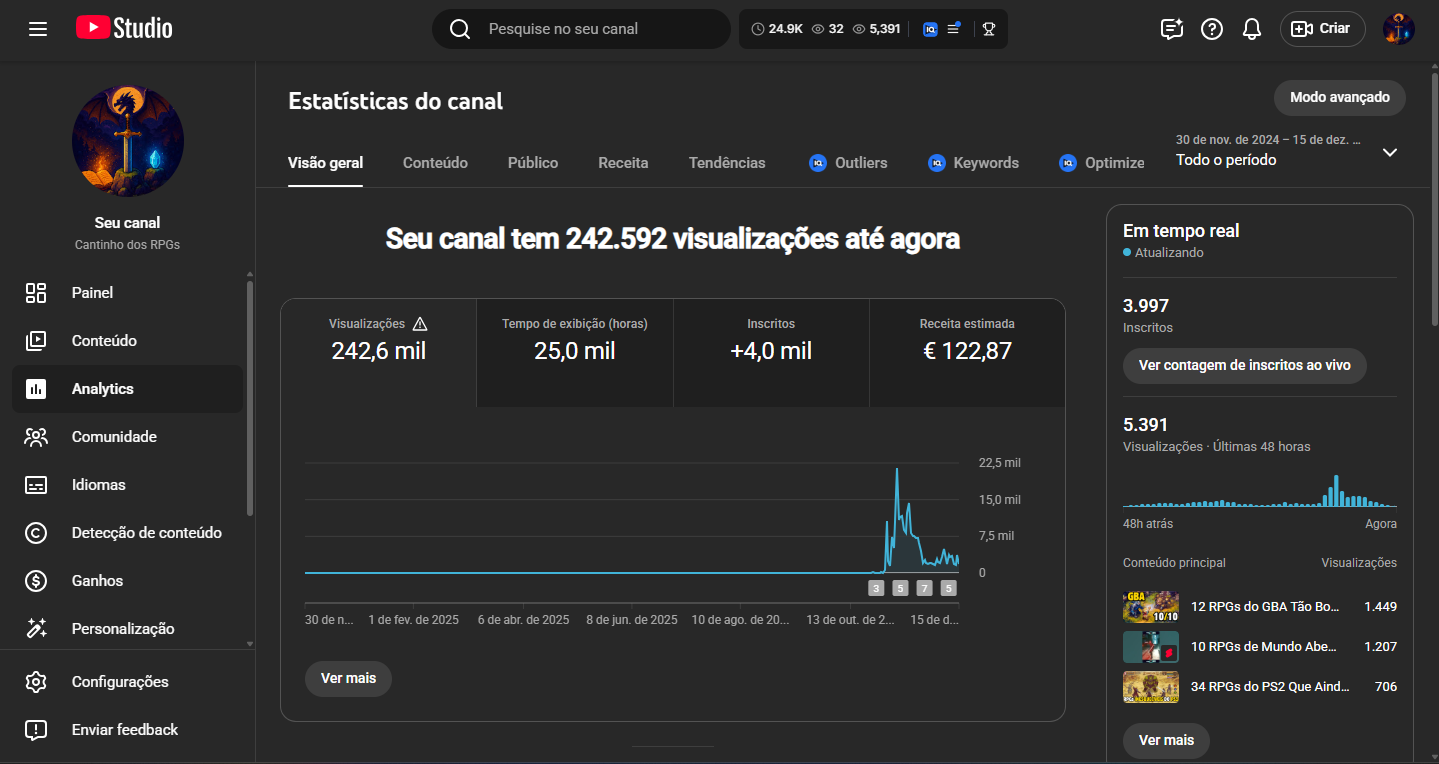 Fiz todos os cálculos e ele pode gerar mais de US$ 300 por mês, pois o RPM por vídeo é superior a US$ 1. As análises mostram um valor de US$ 0,39, mas esse não é o valor final. Aparece apenas porque o canal é novo na monetização.