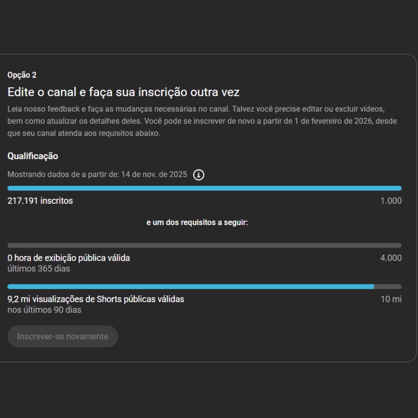 Canal pronto para escalar e bater 1.000 inscritos rapidamente, liberando anúncios completos.