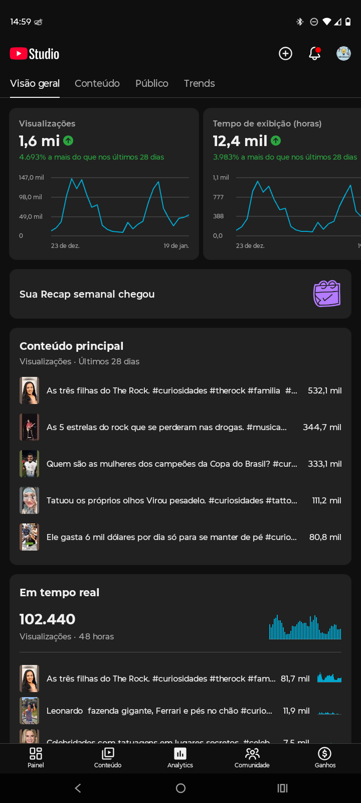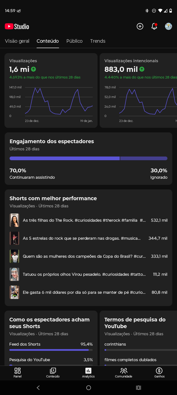 Canal YouTube Shorts – 4.028 inscritos | 1,6M views (28 dias) | Alta retenção