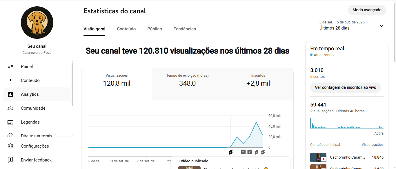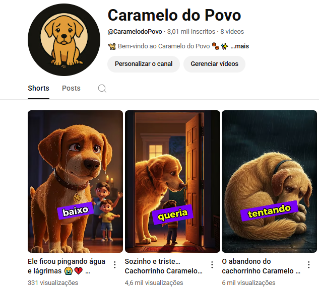 Canal com 3,01 mil inscritos, 8 vídeos publicados e mais de 120,8 mil visualizações nos últimos 28 dias. Aqui você encontra histórias tristes, tocantes e inspiradoras sobre o cachorrinho Caramelo, criadas com inteligência artificial e muito carinho. Cada vídeo mostra a lealdade, a dor e a esperança dos nossos amigos de quatro patas. 💛🐾