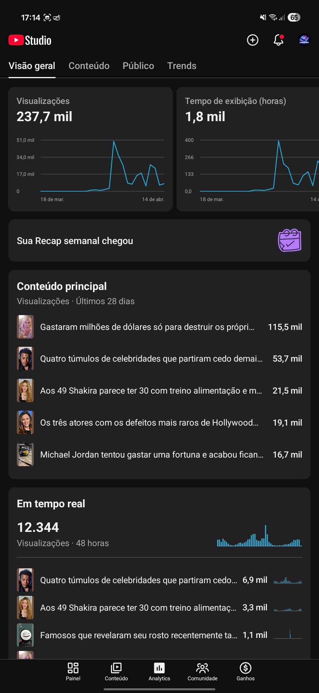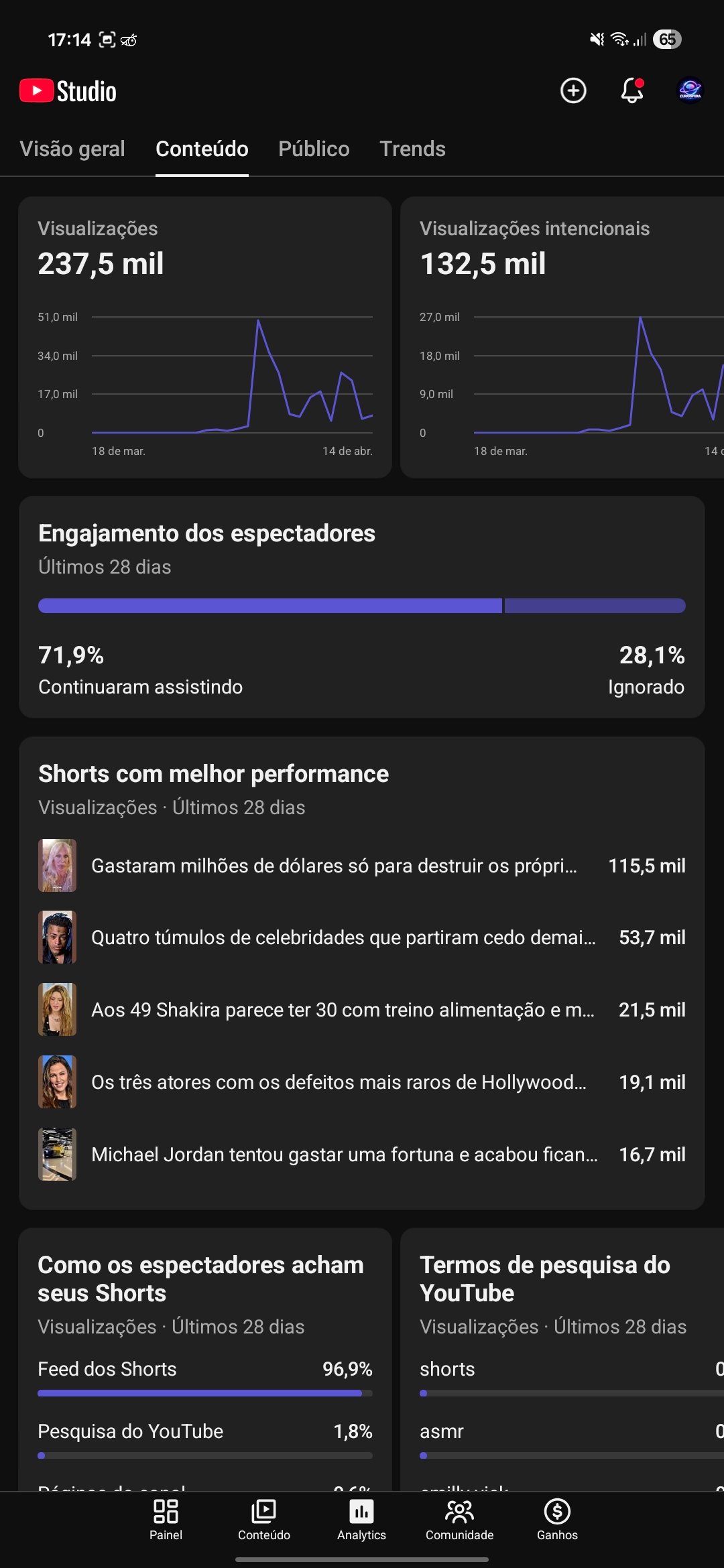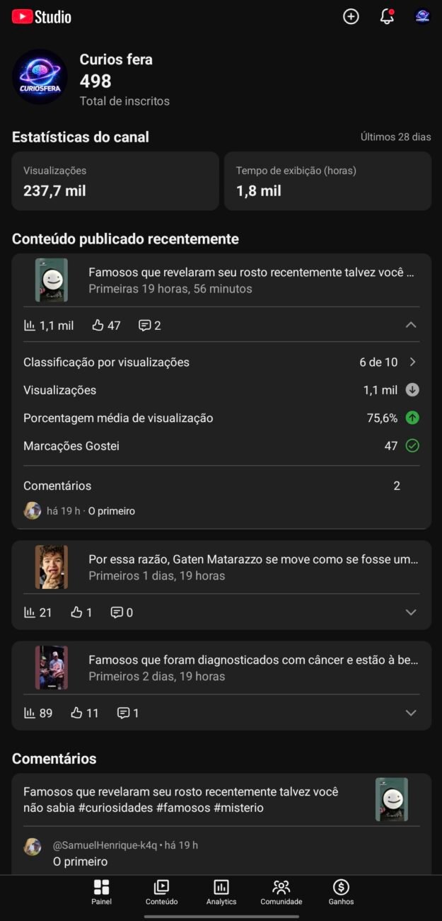 Canal Shorts de curiosidades ativo, com 237 mil views em 28 dias e 498 inscritos.