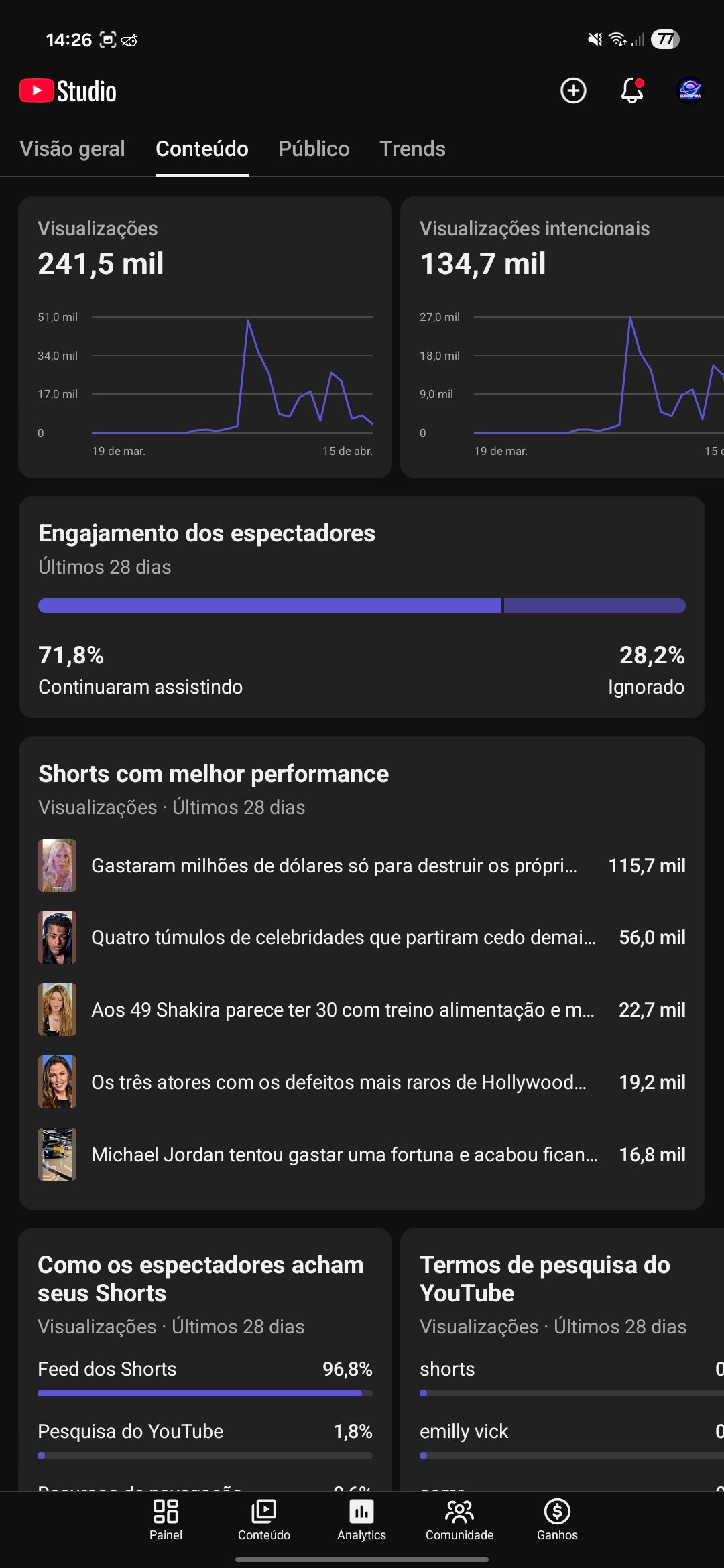 Canal Shorts de curiosidades ativo, com 241 mil views em 28 dias e 507 inscritos.