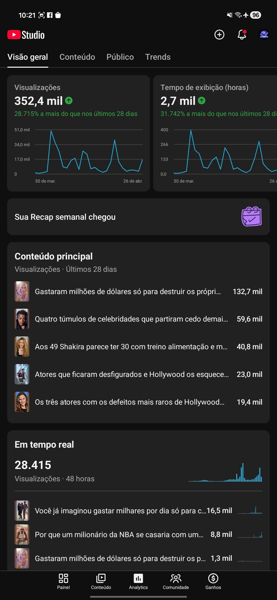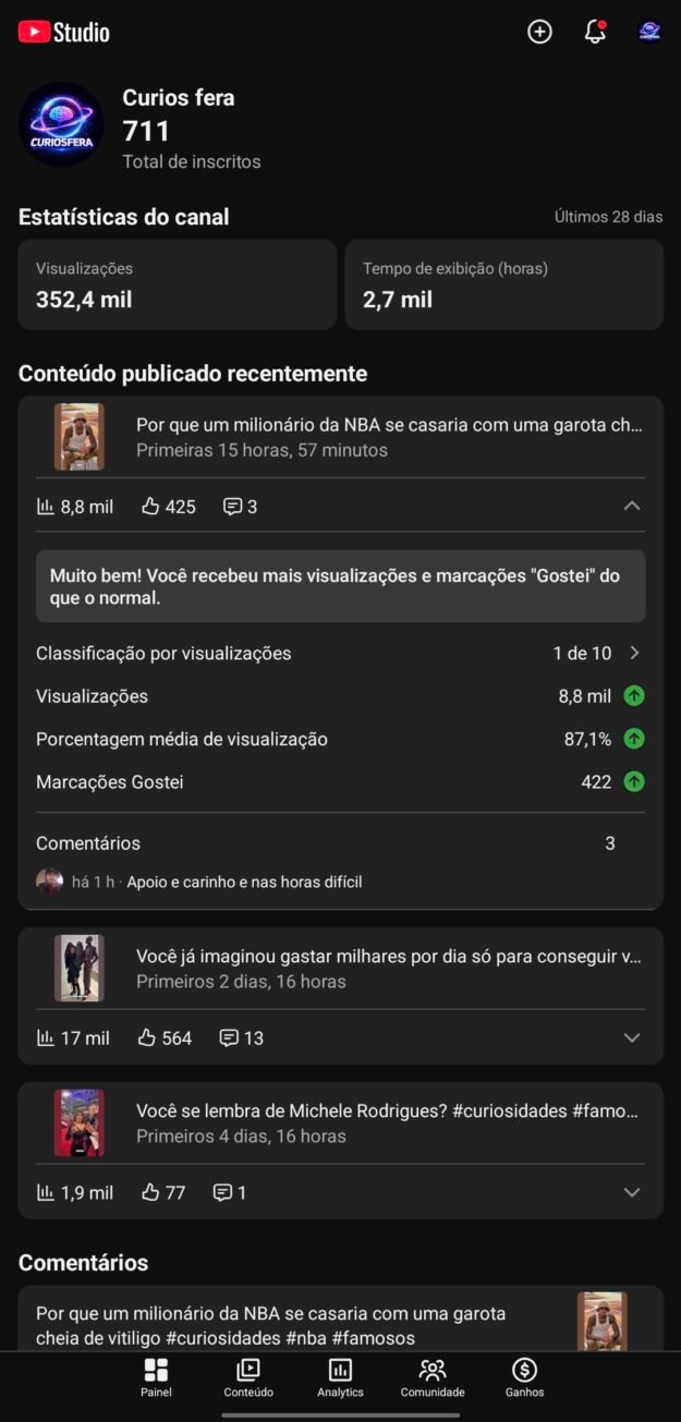 Canal de curiosidades em crescimento, com 352 mil views em 28 dias e mais de 700 inscritos.
