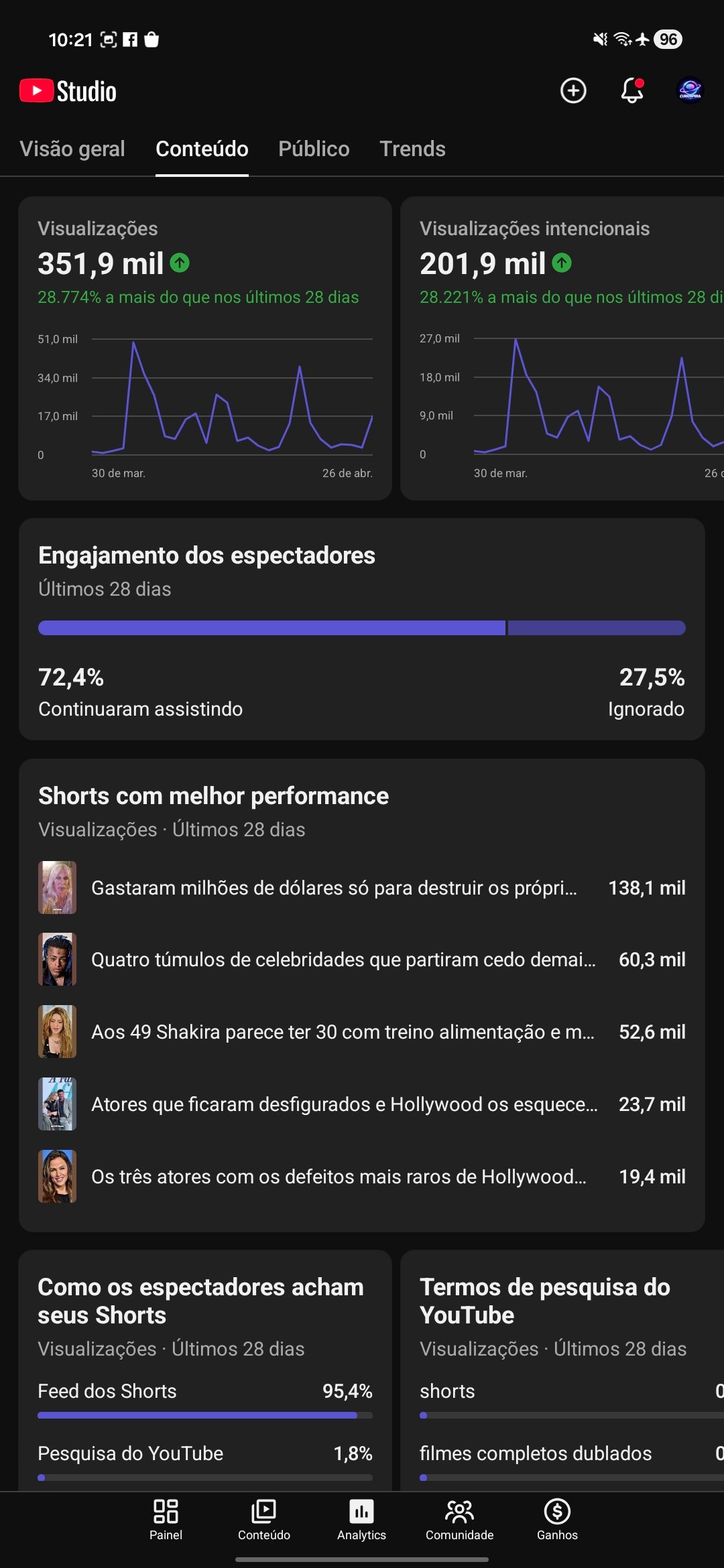 Canal YouTube Shorts Curiosidades – 350k views / 700+ inscritos (Crescendo)