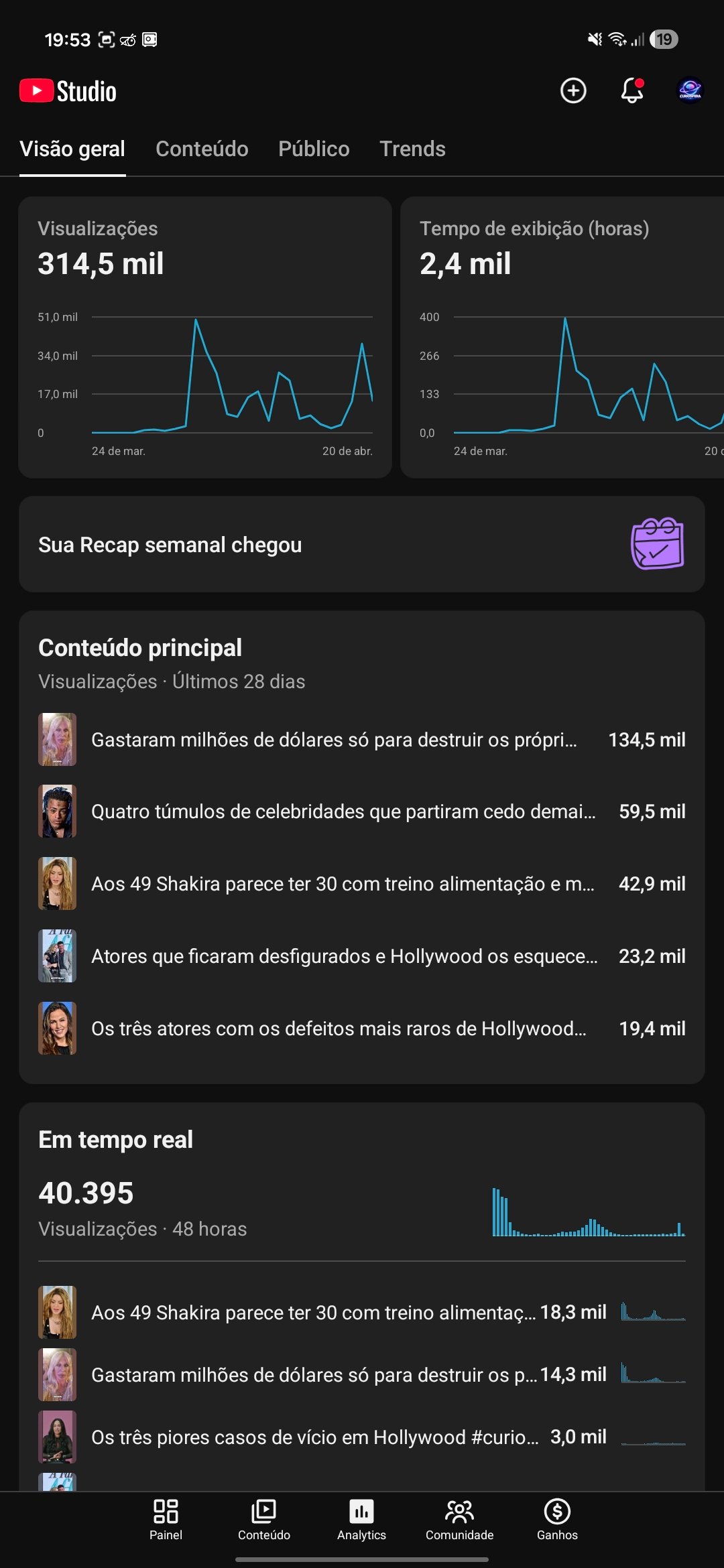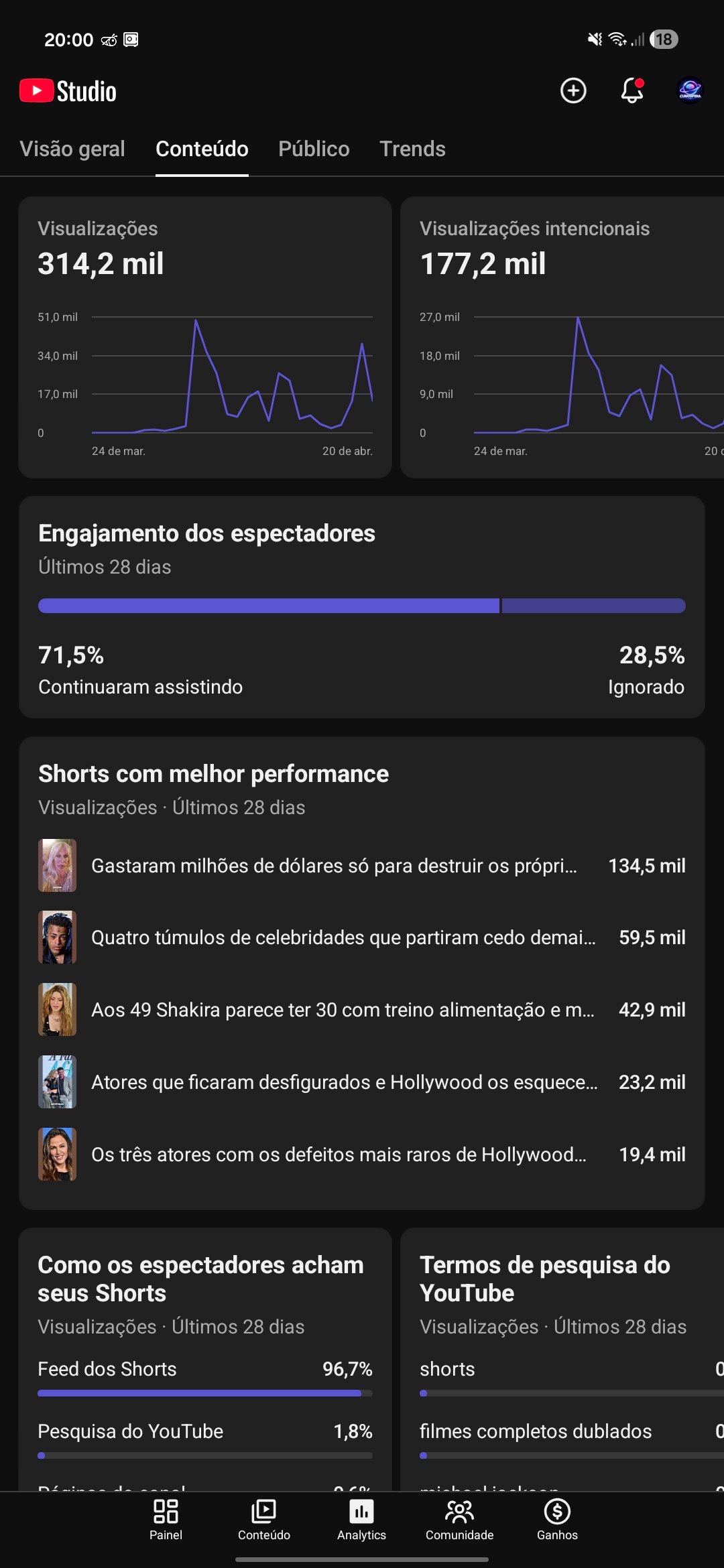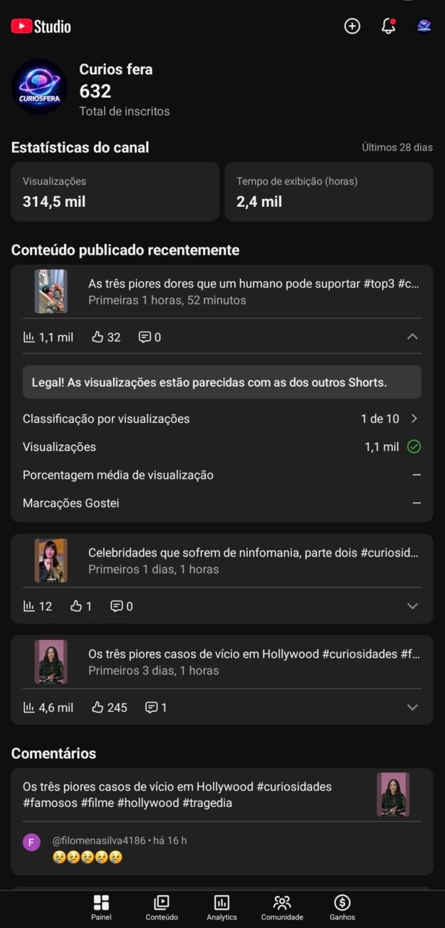 Canal YouTube Shorts Nicho Curiosidades – 630+ inscritos, 314 mil views (crescendo)