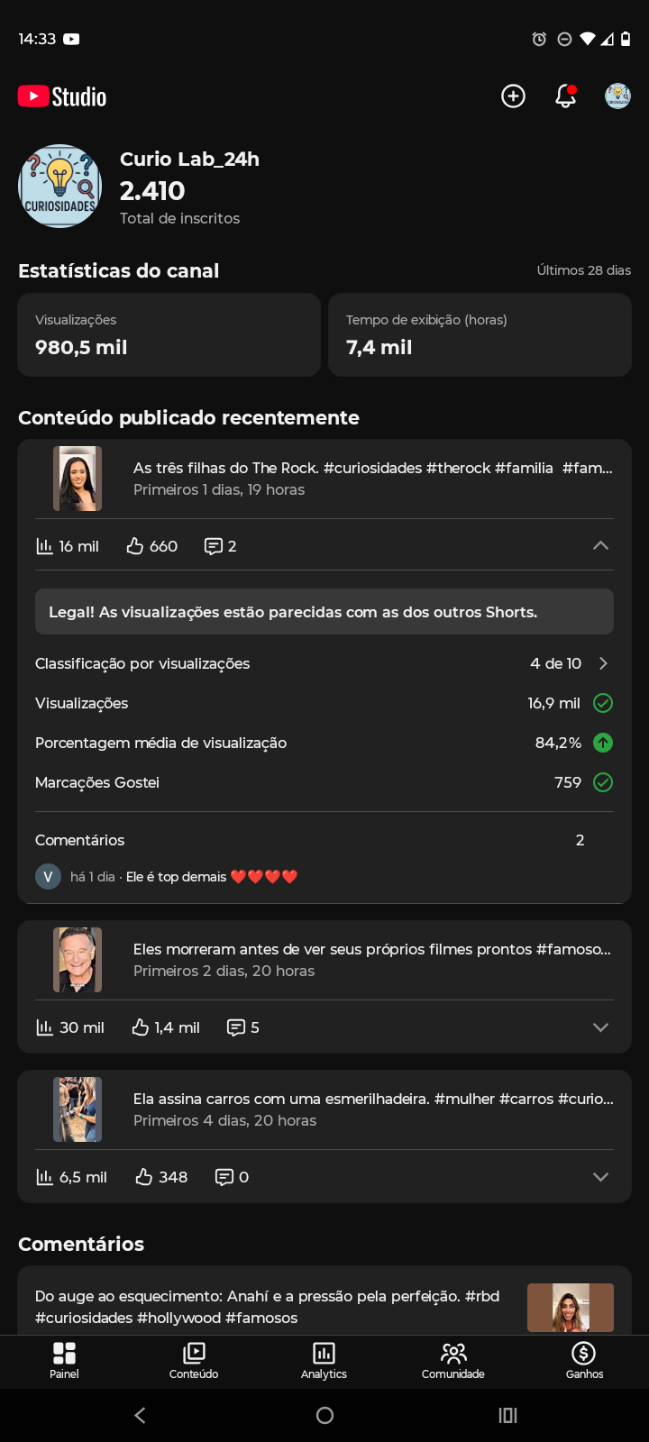 Canal de YouTube Shorts com alto alcance orgânico e vídeos entregues pelo algoritmo.
