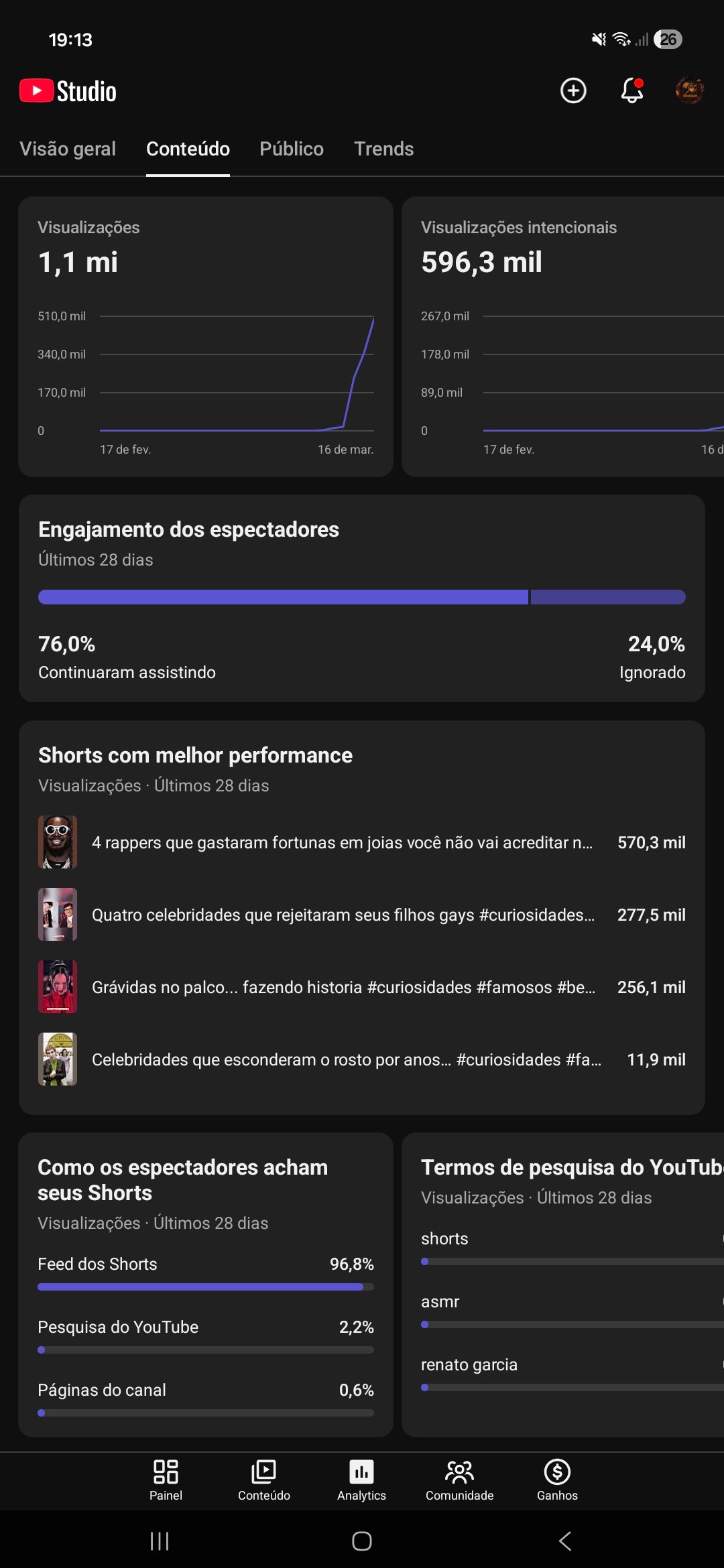 Forte entrega no algoritmo (96% via feed do Shorts)