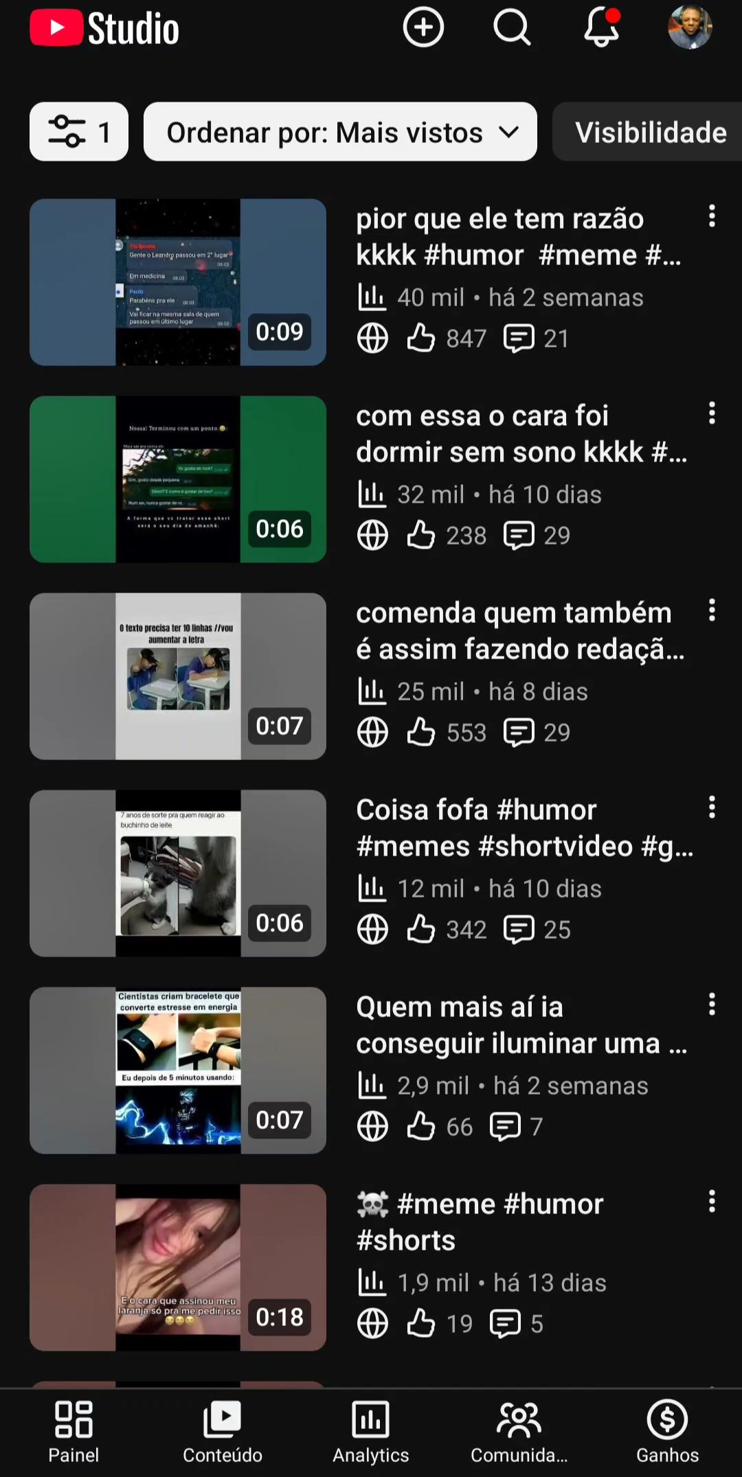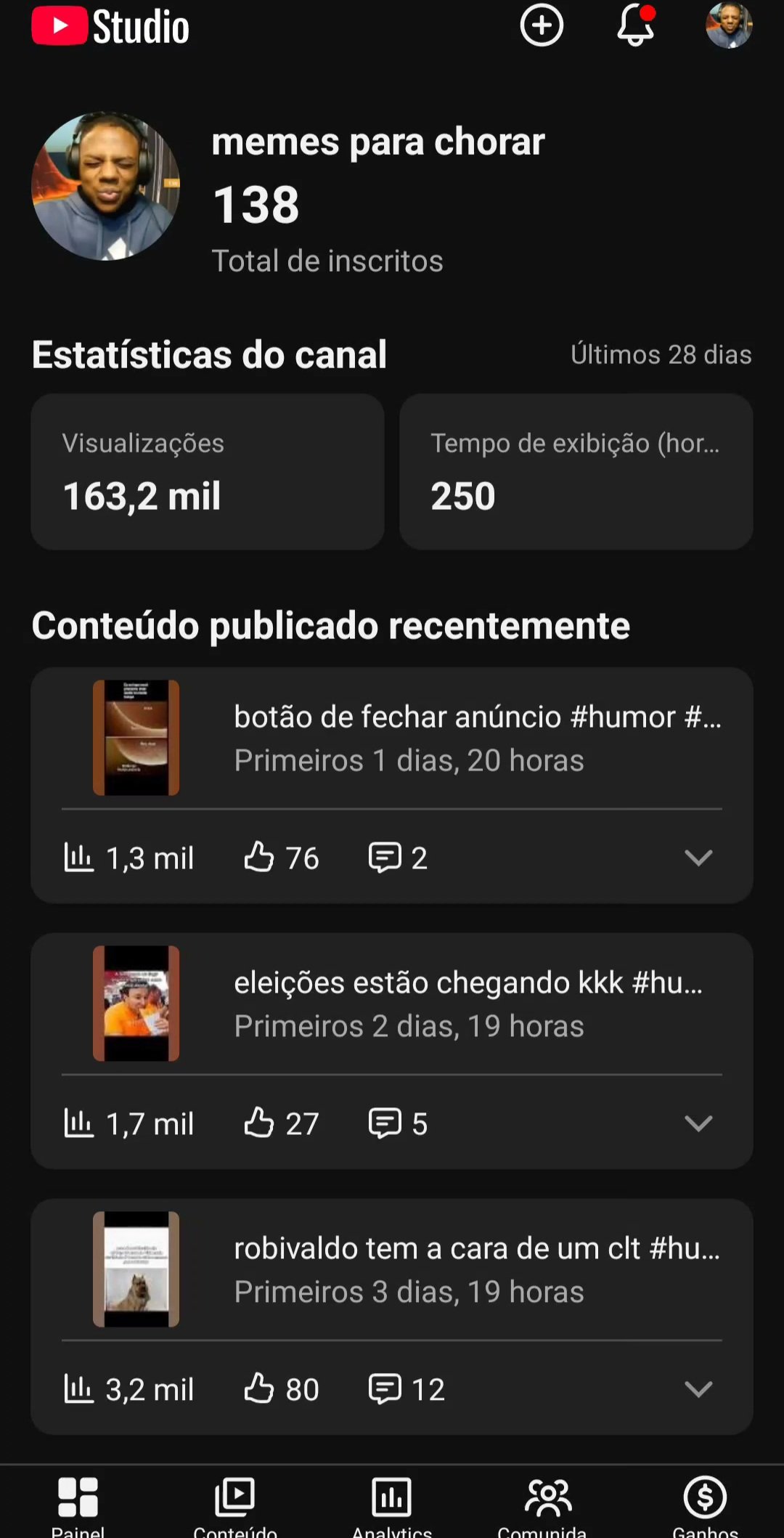 nicho focado em vídeos engraçados/memes. 160k de visualização nas últimas 2 semana, vídeos bem engajados🔥