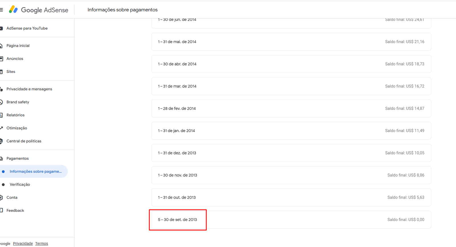 Conta Google Adsense de 2013 com site, NÃO RECEBEU PAGAMENTOS.