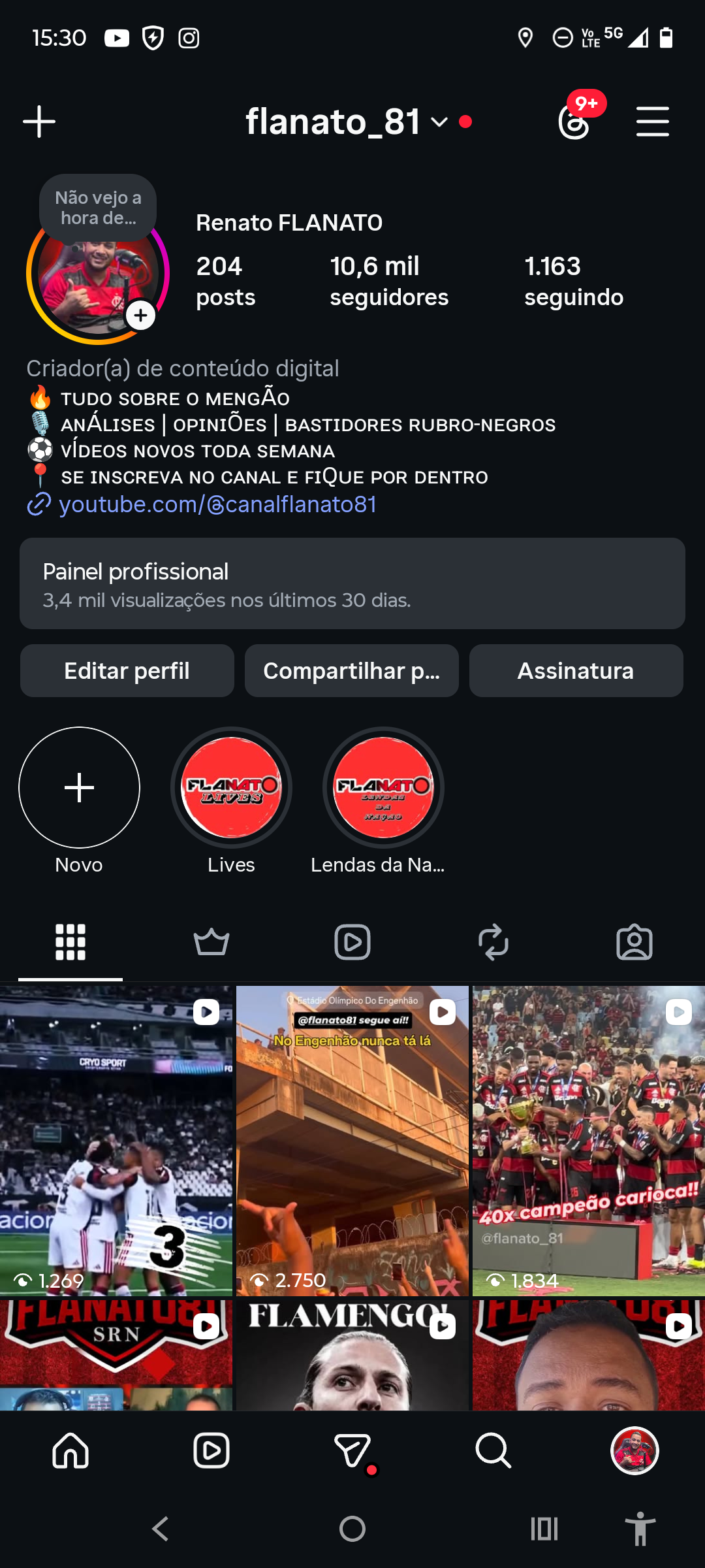 Instagram com engajamento. Mais de 10.600 seguidores, nicho do flamengo com alguns influenciadores nos seguindo.