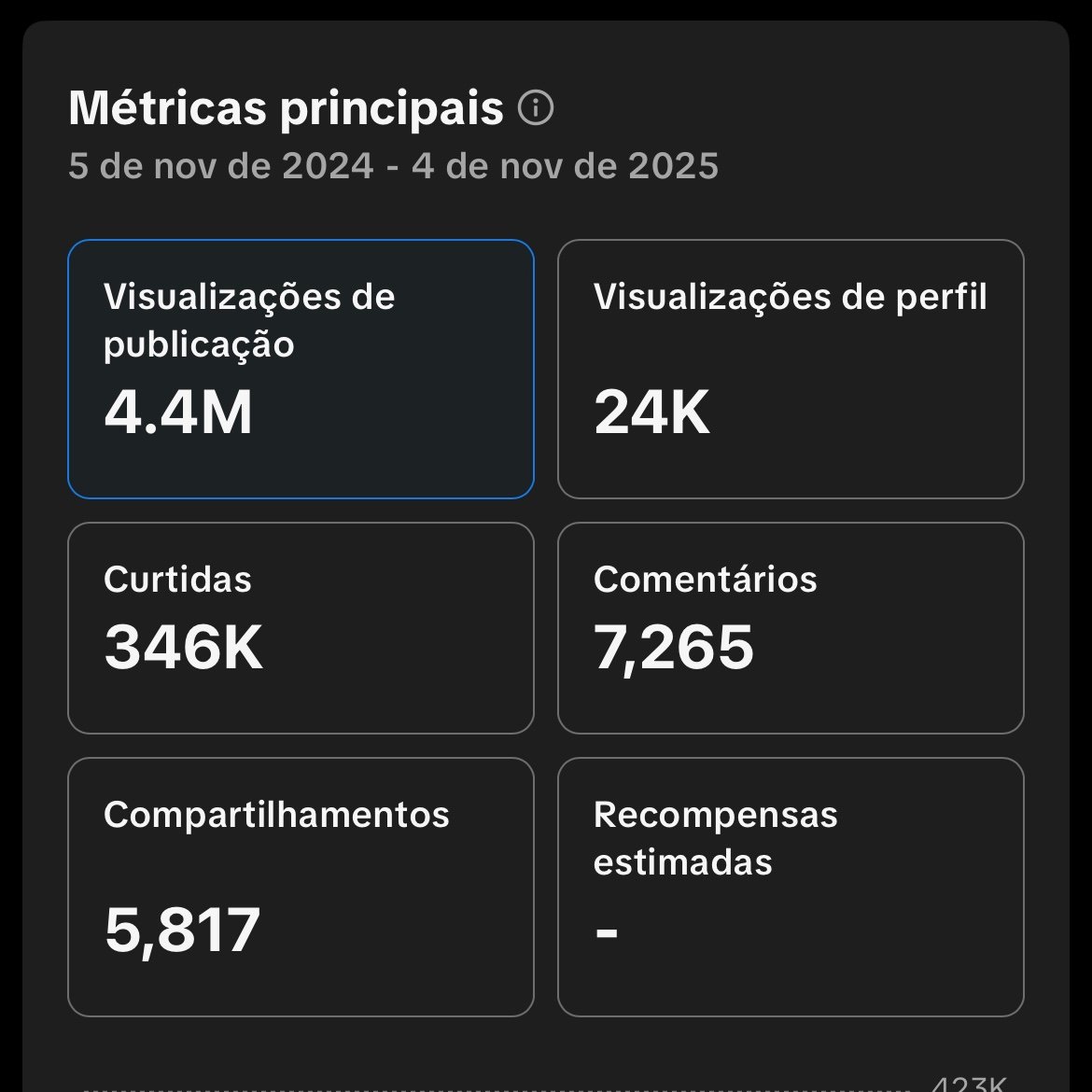 Conta, com mais de 5 MILHÕES de visualizações totais e 1 MILHÕES de visualizações qualificadas no Programa de Criação do TikTok.