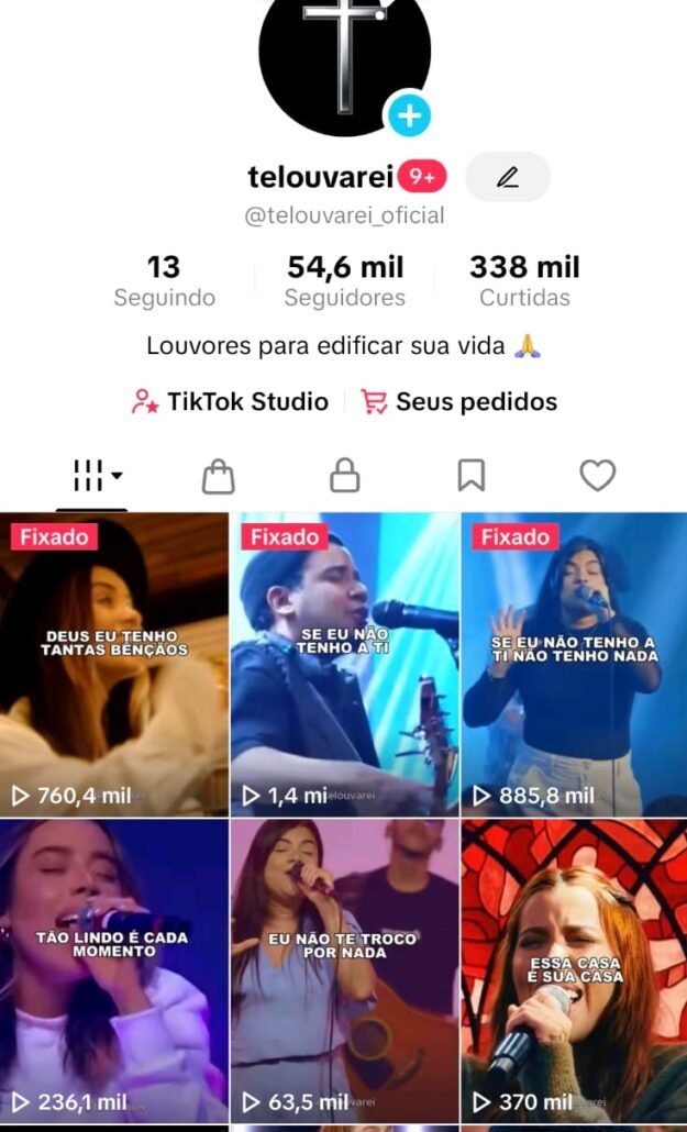 Conta de TikTok com 54 mil seguidores orgânicos no nicho de louvor e 338 mil curtidas, conquistados com poucos vídeos — mostrando alcance real e forte interesse do público.