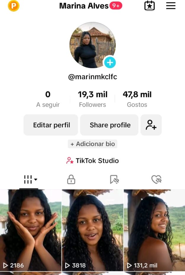 Conta do TikTok com 19 mil seguidores, monetização ativa e sem documentos cadastrados.