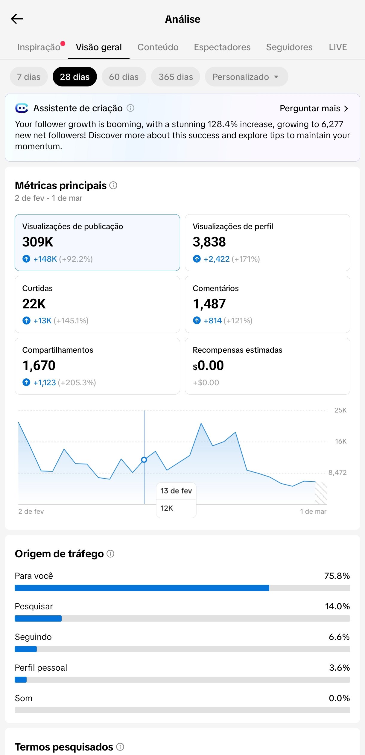 Conta TikTok com 12,7 mil seguidores e excelente desempenho recente. Nos últimos 28 dias atingiu 309 mil visualizações, 22 mil curtidas, 1.487 comentários e 1.670 compartilhamentos, demonstrando forte engajamento orgânico.
