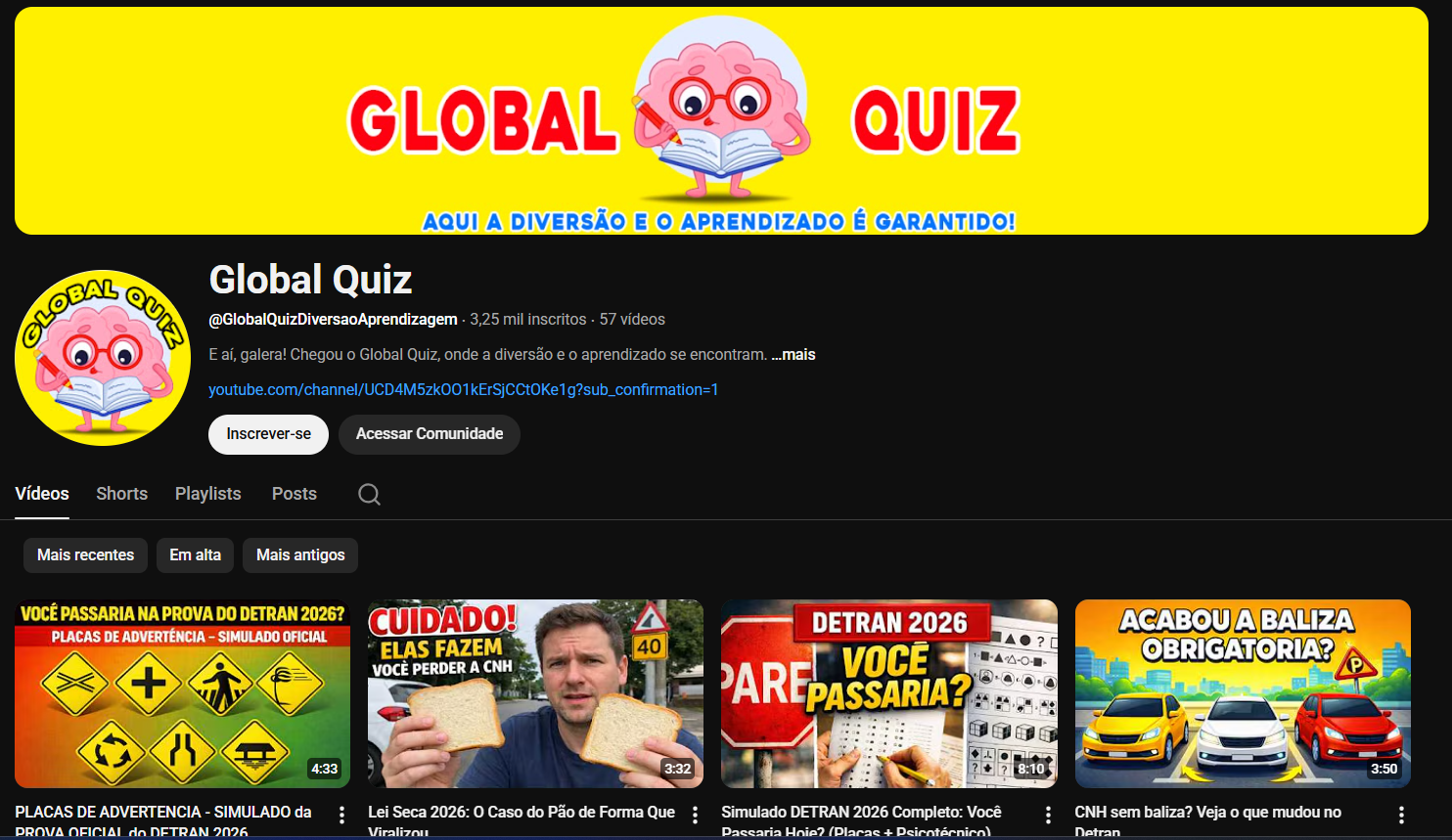 Você quer entrar no YouTube sem aparecer, mas não quer começar do zero absoluto? O canal @GlobalQuiz é a base perfeita. O nicho de Quiz/Testes é um dos que mais cresce no mundo por ser altamente viciante e gerar um tempo de exibição (Watch Time) gigante.