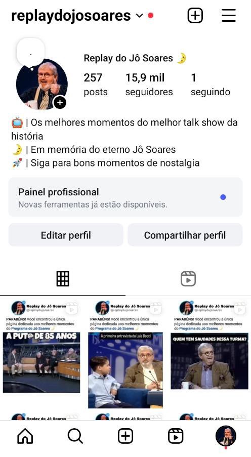 Instagram @replaydojosoares bem engajado e crescendo bem, 2.6 milhões de alcance e chegando a 16 mil seguidores