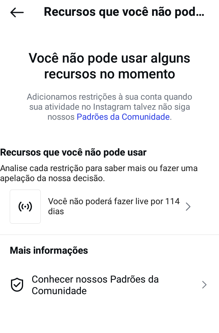 - Detalhes da Restrição: Não permite fazer lives no momento devido a uma restrição. Monetição está liberada. Restrição não interfere nas publicações nem no alcance.