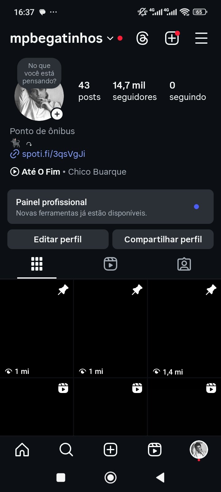 Perfil voltado para músicas, artistas e trilhas sonoras, com reels virais que já ultrapassaram 1 milhão de visualizações.