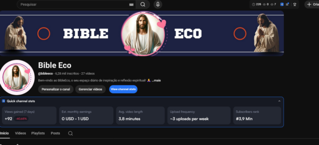 Adquira o BibleEco, um canal do YouTube de sucesso e já monetizado, especializado em conteúdo cristão de alto impacto, espiritual e motivacional. Com mais de 6.000 inscritos fiéis e engajamento crescente, este canal representa uma oportunidade única de entrar em um mercado lucrativo com uma base sólida já construída.