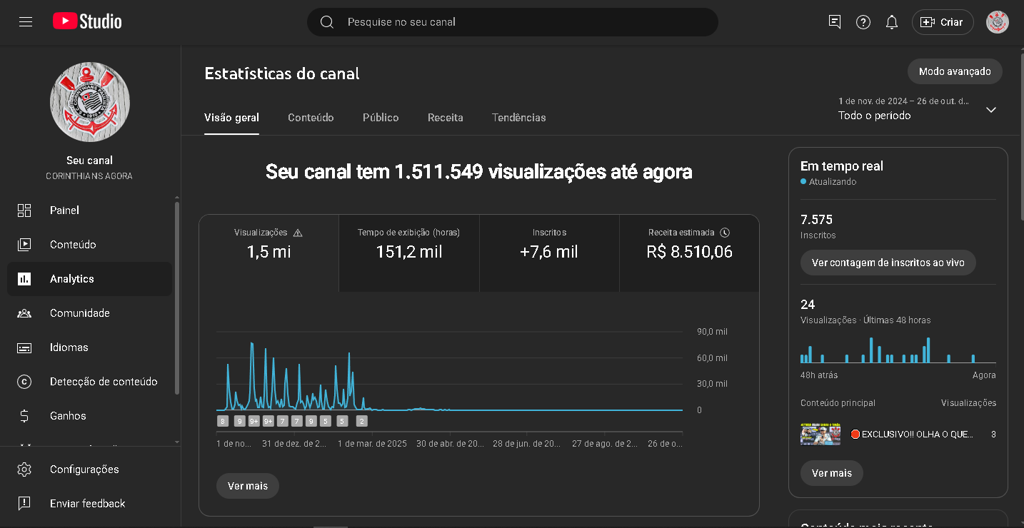 Canal de Notícias do Corinthians bem engajado, com quase 8 mil inscritos.