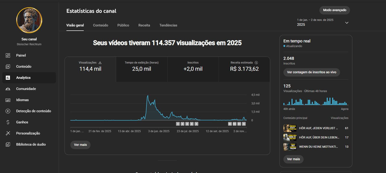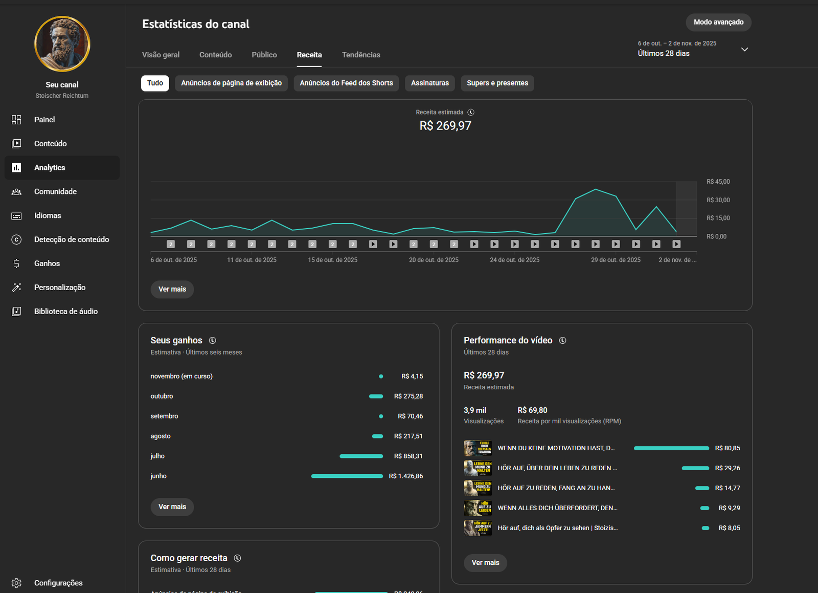 ✅ Canal já rendeu +R$ 3k, RPM Médio de R$ 60 – R$ 70 – Se você estourar um vídeo, paga o investimento do canal.