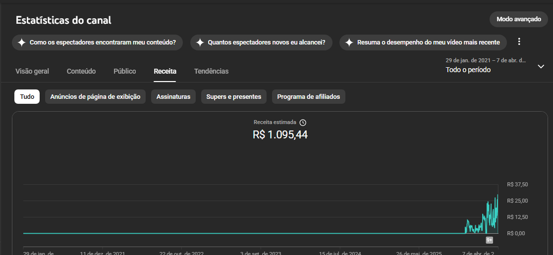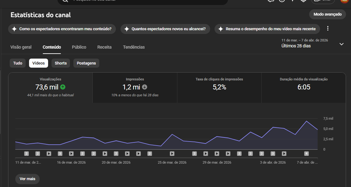 • Conteúdo com boa retenção (vídeos longos performando bem)