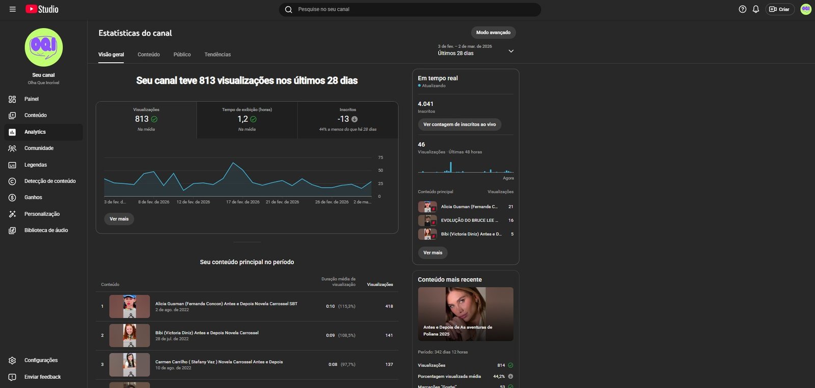 •Conteúdo Comprovado: Com 34 vídeos publicados, o canal já demonstrou capacidade de criar conteúdo viral, com vídeos atingindo 51 mil e 43 mil visualizações em temas como “Novela CARROSSEL Antes e Depois Com Idades” e “Top Meninos Mais Lindos da Novela Carrossel”. Shorts também apresentam bom desempenho, com vídeos acima de 5 mil e 6 mil visualizações.