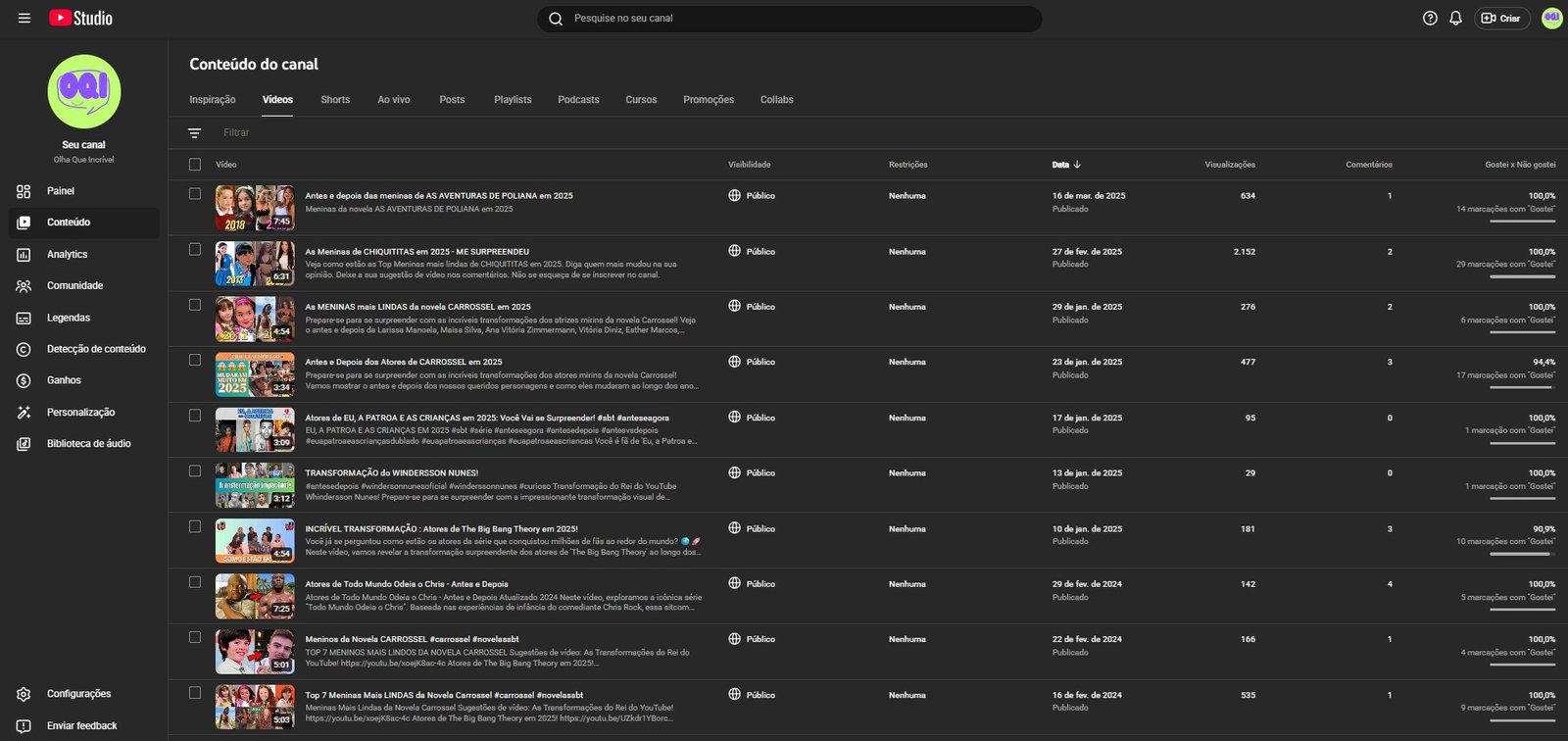 Este canal é especializado no cativante nicho de “Antes e Depois” de celebridades, atores e personagens icônicos de novelas e séries (como Carrossel, Chiquititas, As Aventuras de Poliana, entre outros). O conteúdo é atemporal, gerando nostalgia e curiosidade, o que garante um engajamento consistente e um vasto potencial de alcance.