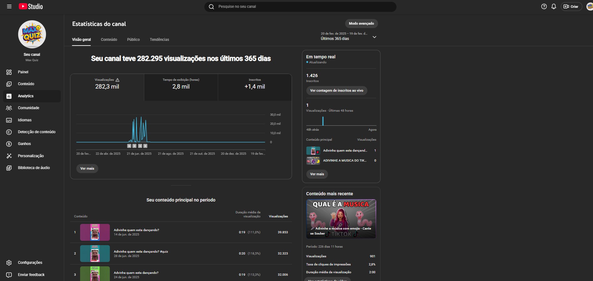 Conteúdo Comprovado e Viral: Com 17 vídeos publicados, o canal já demonstrou forte desempenho, com vídeos atingindo impressionantes 39 mil, 32 mil e 29 mil visualizações em quizzes como “Adivinhe quem esta dançando?” e “ADIVINHE A MUSICA DO TIKTOK COM EMOJIS 🎼 QUEM ESTA CANTANDO?”.