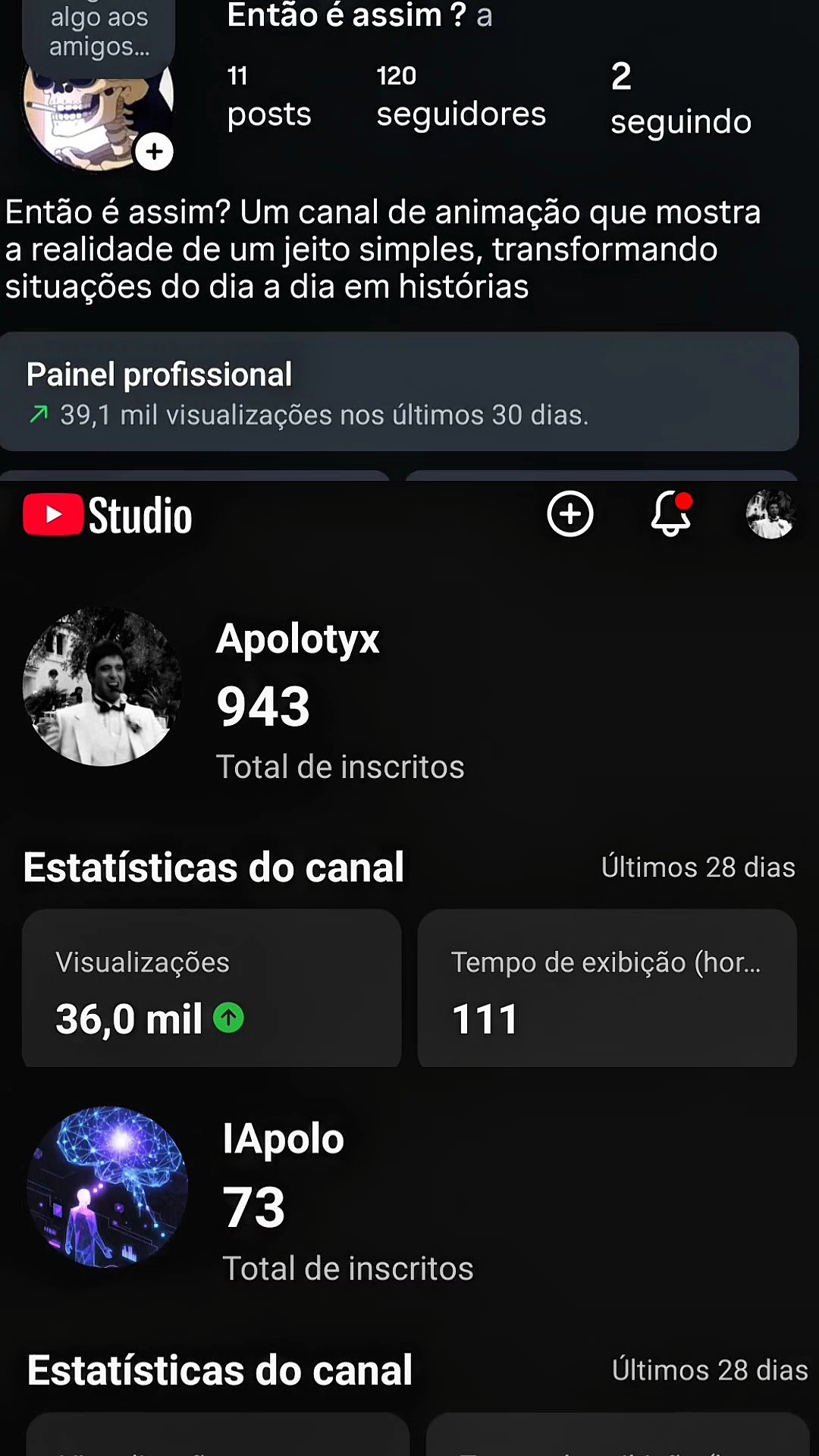 📺 YouTube Apolotyx (2021): Conta rara com 4 anos de autoridade. +36k views/mês e quase 1.000 inscritos. Nicho de animação. 💎