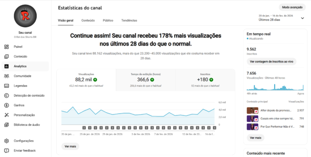 🔔 Importante: O canal ainda não é monetizado, o que permite ao novo proprietário desenvolver a estratégia ideal para atingir os requisitos de monetização e escalar da forma que preferir.