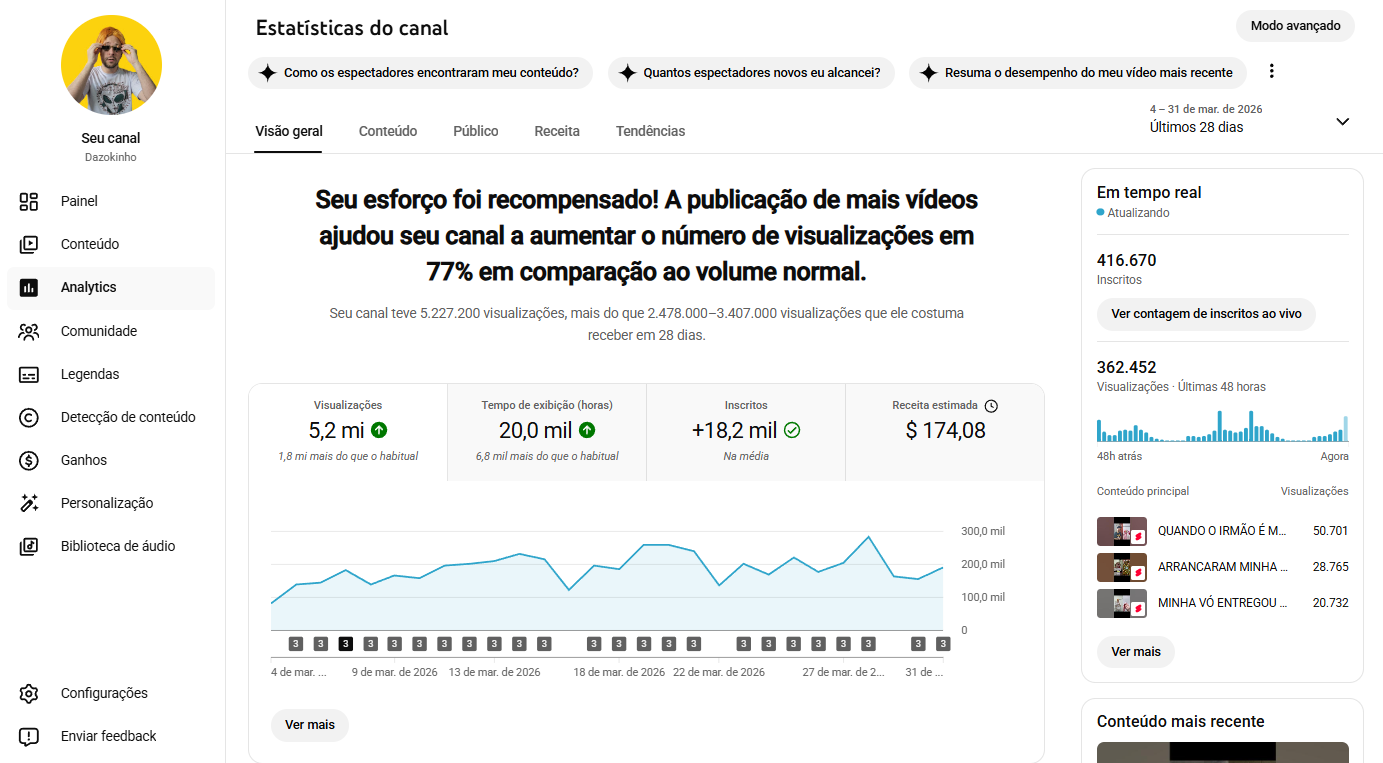 Canal brasileiro de comédia com 416.670 inscritos e crescimento acelerado. Nos últimos 28 dias registrou 5,2 milhões de visualizações (77% acima da média), 20 mil horas de tempo de exibição, +18.200 novos inscritos e receita ativa em dólar.