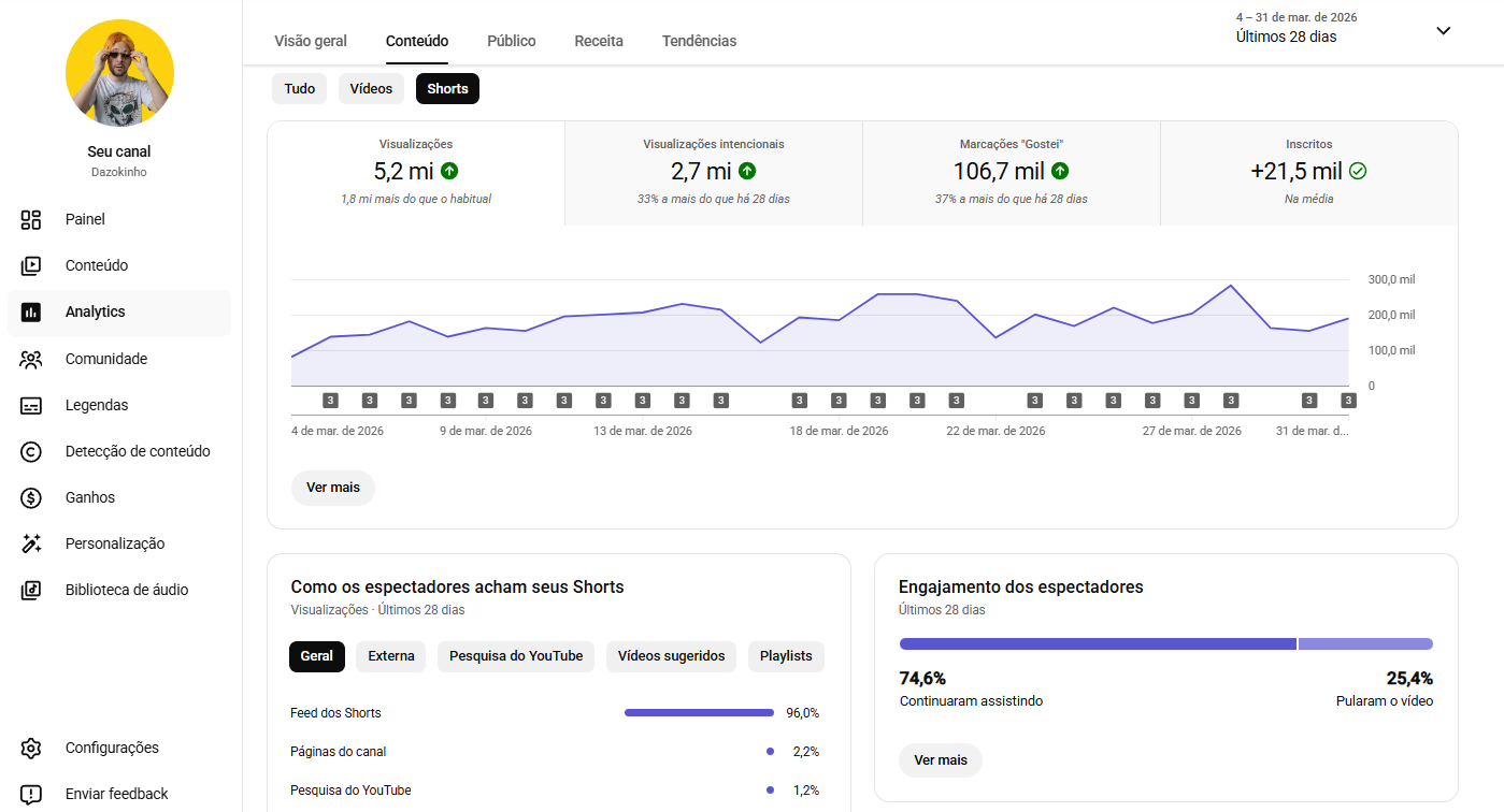 Um único vídeo viral aqui já entrega mais do que canais com o dobro de inscritos.
