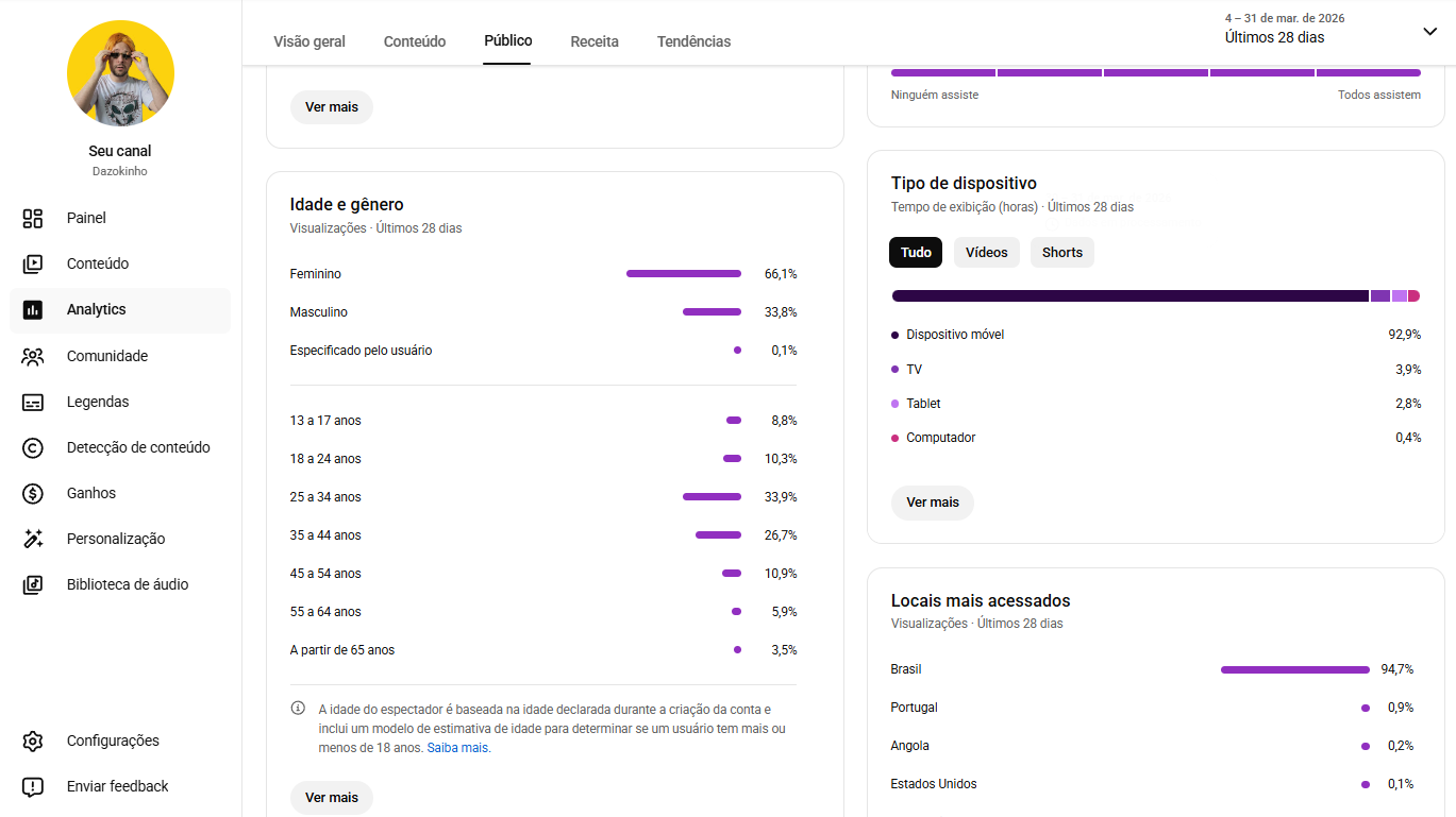92,9% acessando pelo celular — comportamento ideal para conteúdo de Shorts e afiliados mobile