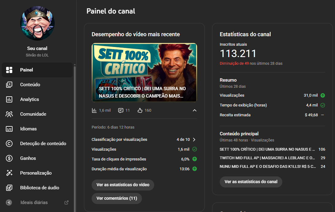 Se você busca um ativo digital no nicho de games com uma identidade única e engajamento real, o Silvão do LOL é a escolha certa. Com mais de 113.000 inscritos e quase 13.657.161 mil visualizações, este canal já provou sua força no universo de League of Legends. Unindo o gameplay de um dos jogos mais jogados do mundo com uma pitada de humor e personalidade, o canal já passou pela barreira da monetização e está pronto para gerar receita imediata.