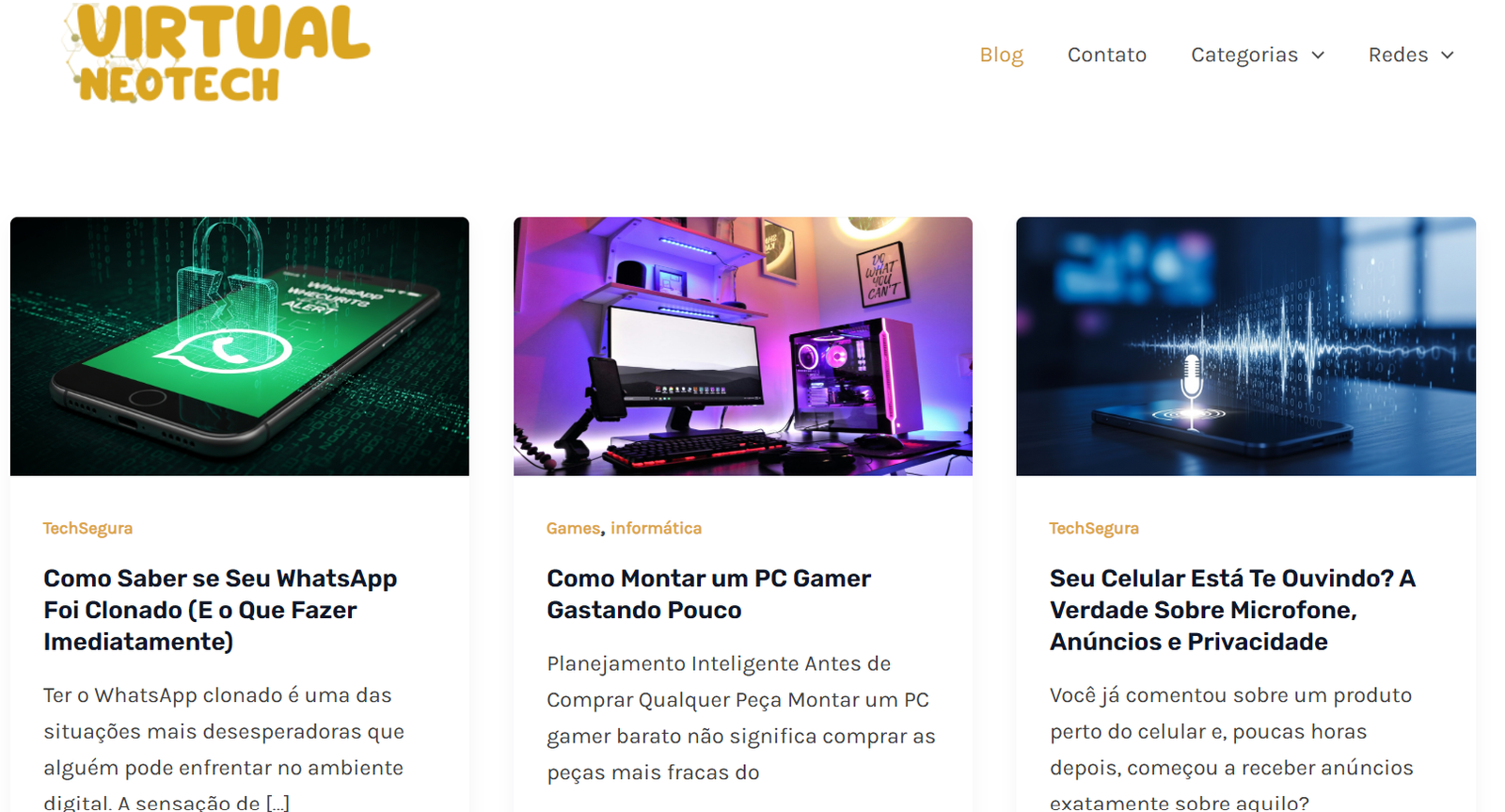 O Virtual NeoTech é a oportunidade definitiva para quem deseja ser dono de um blog de autoridade sem começar do zero. O site já vem carregado com 50 artigos originais, garantindo uma estrutura robusta de conteúdo para os buscadores. Mais do que um site bonito, ele possui uma base de 80 backlinks apontados, o que confere ao domínio a relevância necessária para subir rapidamente nos rankings de busca e atrair tráfego orgânico qualificado.