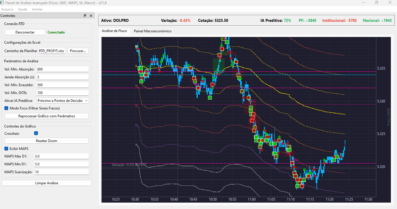 Indicador LAP (Liquidity Anchor Projections): Nosso modelo exclusivo vai além da VWAP. Ele projeta zonas de volatilidade com base no desvio padrão ponderado pelo volume, mostrando matematicamente onde estão as regiões de “premium” e “discount” mais prováveis do dia. É o seu mapa para operar nos extremos.