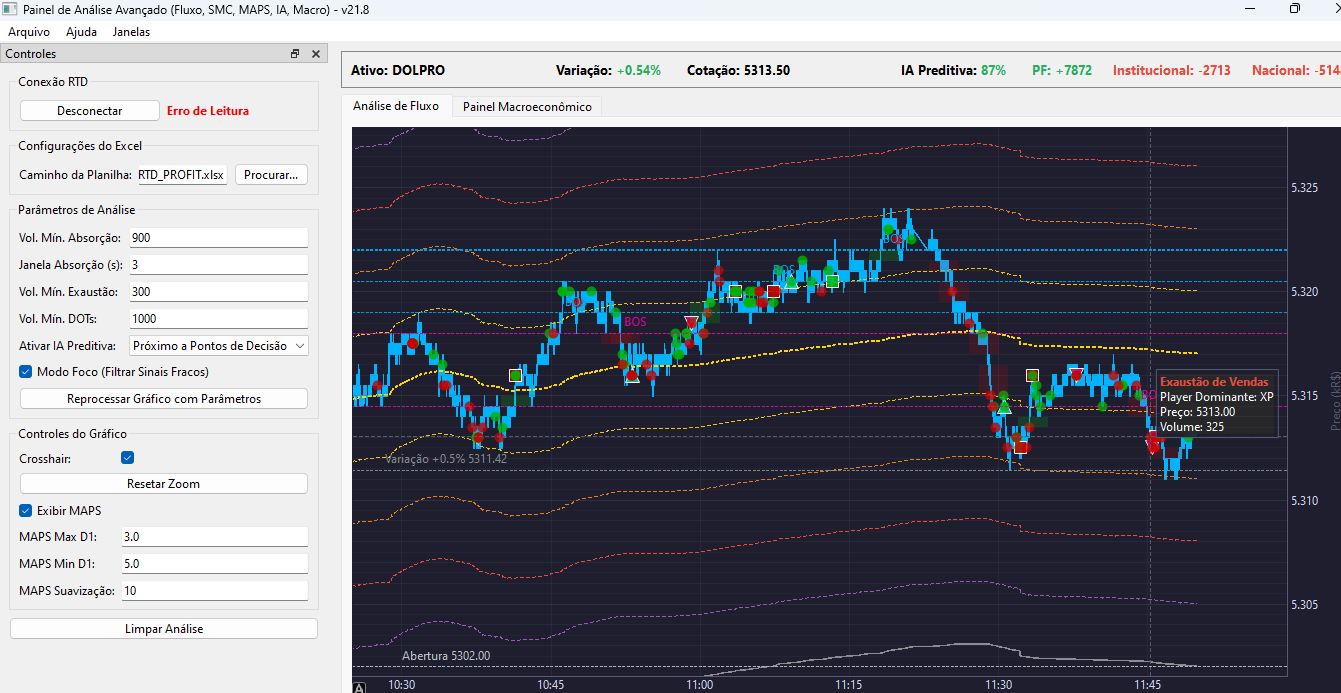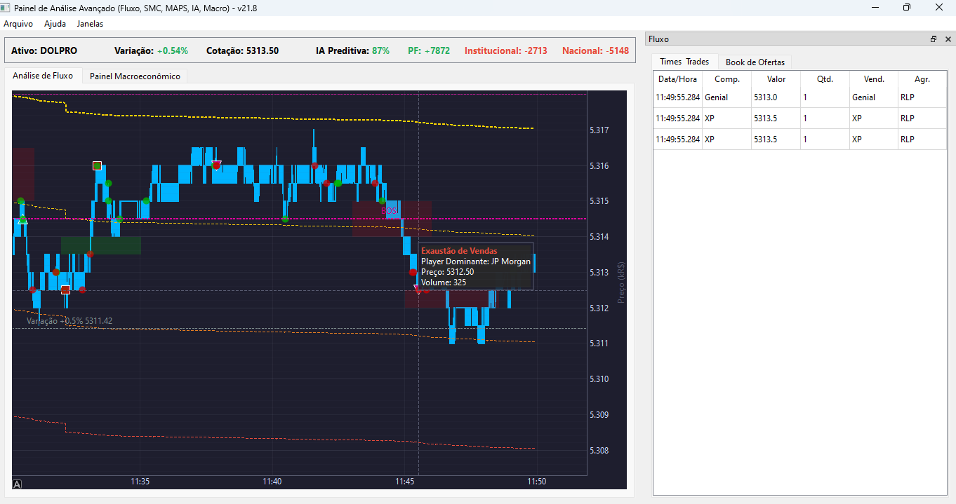 ✅ Tape Reading no Piloto Automático: Receba alertas visuais no gráfico para padrões de Absorção e Exaustão, confirmando seus gatilhos de entrada e saída.
