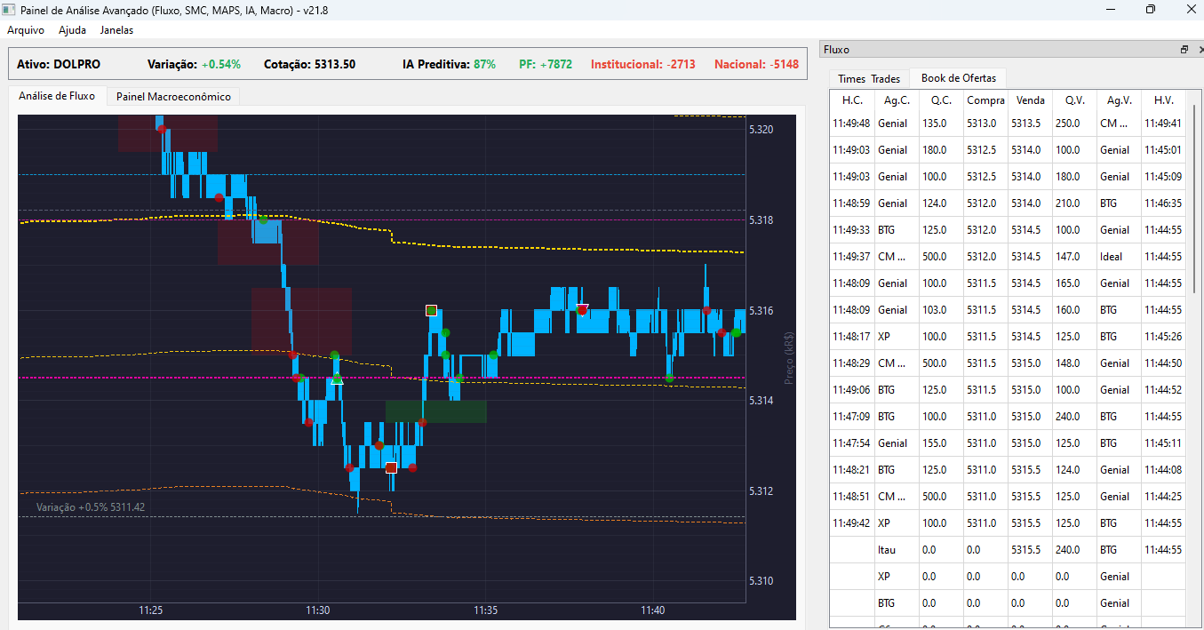 Book de Ofertas Inteligente: Filtramos 90% do ruído para você focar no que importa. Nosso sistema exibe apenas os lotes acima do tamanho que você define e destaca em amarelo as ordens institucionais, revelando as “muralhas” de liquidez que podem segurar o preço.