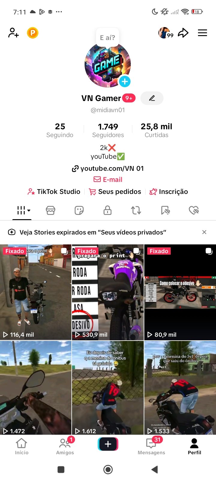Conta do tik Tok com quase 1 milhão de views conta parada pois o proprietário está com outra conta recebendo proposta de incentivo de jogos por cada mil views