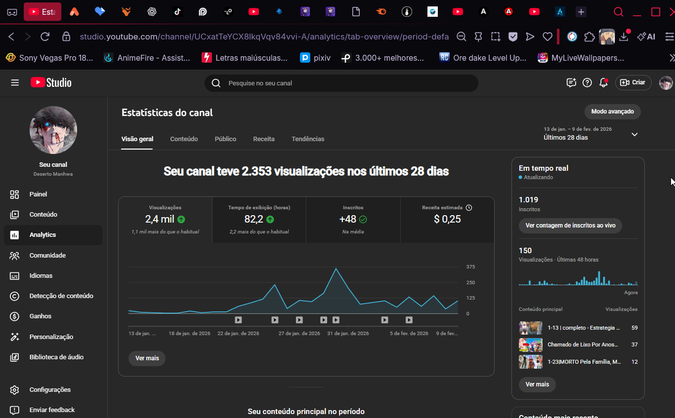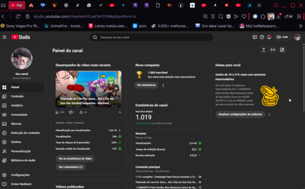 • Algoritmo de Segmentação: O canal já está identificado pelo YouTube como pertencente ao nicho de anime e quadrinhos, facilitando que seus novos vídeos alcancem o público certo.