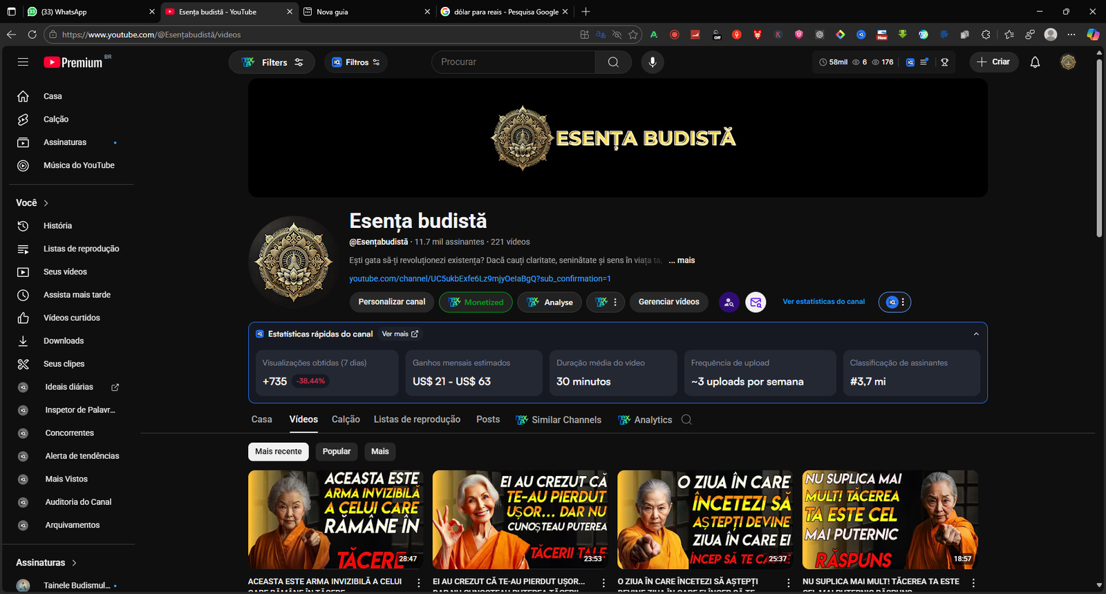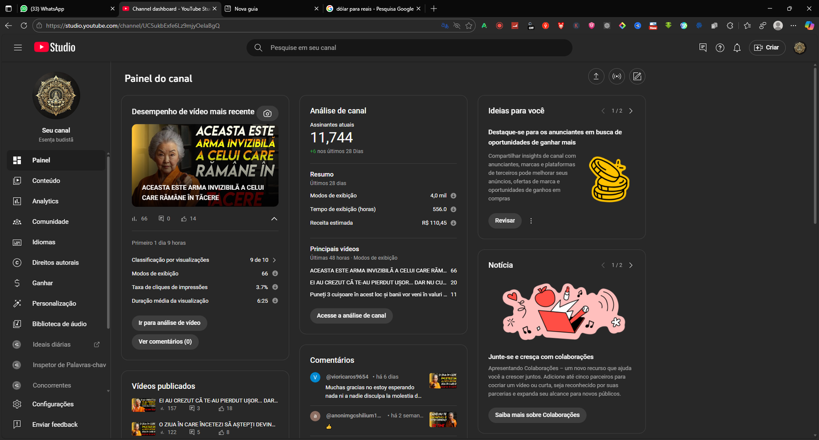 VENDO CANAL DE ESPIRUTUALIDADE, CANAL MUITO TOP, COM QUASE 12.000 ESCRITOS CANAL DA ROMENIA, GERANDO RECEITA OTIMA, POSTO 3 VIDEOS POR SEMANA MANTENDO A CONSISTENCIA, CANAL NOVO MONETIZADO SEM STRICK,NADA DO TIPO MUITO BOM TENHO 6 CANAIS DO TIPO, VIDEOS FACIL DE FAZER. CANAL COM 222 VIDEOS E NAO FICA PARADO SEMPRE MANTENDO CONSISTENCIA