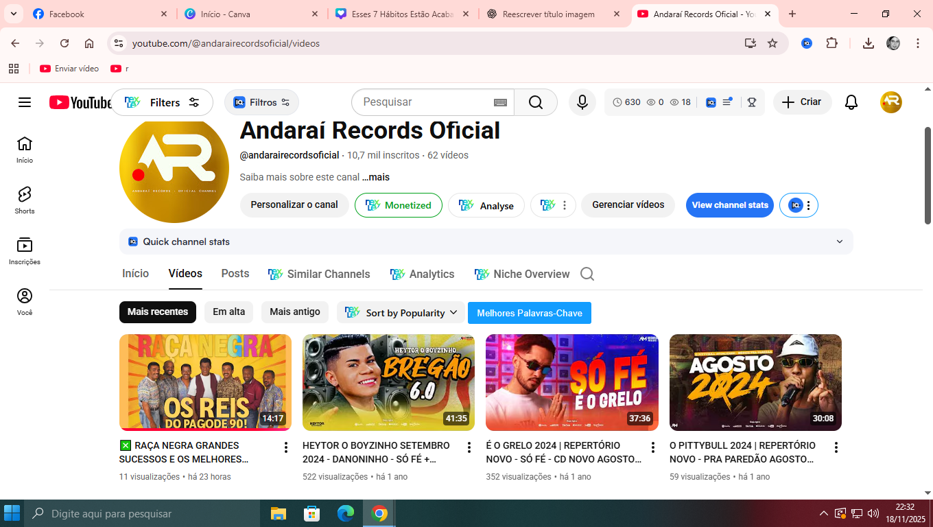 Vendo canal de musica com 10.700 inscritos e com 2.140.882 visualizações e 62 vídeos com muitas visualizaçôes.