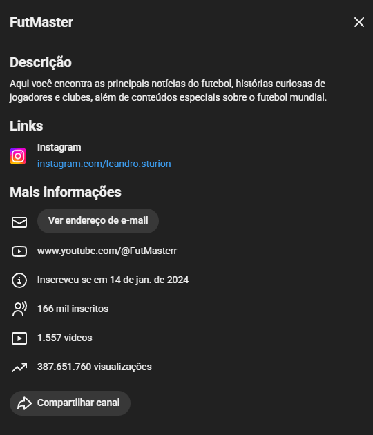 - Link da Conta: https://www.youtube.com/channel/UCR2m3Zq1fIe2LQWRJG0ZUcg/