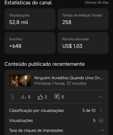 Canal 5300 inscritos e já foi monetizado – Troquei de nicho e falta 1.100 horas pra pedir a monetização novamente! Nicho de Histórias.